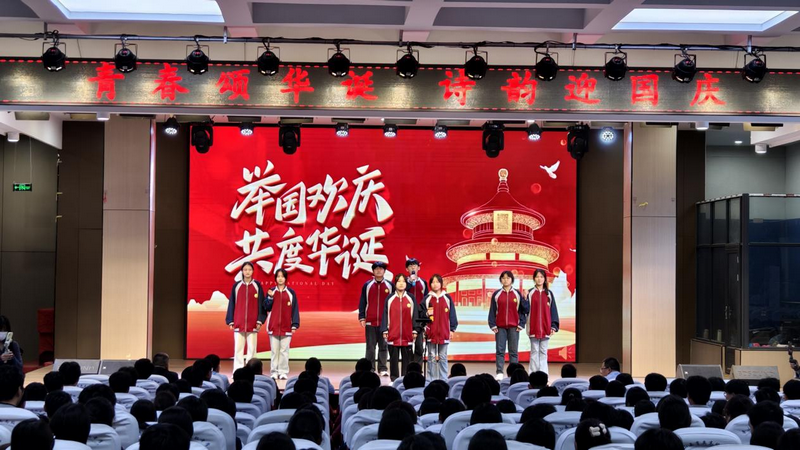 2025年9月29日晚,鲁山县育英高中学术报告厅内气氛热烈,一场主题为“青春颂华诞 诗韵迎国庆”的诗文朗诵比赛在此举行。近千人的报告厅内座无虚席,莘莘学子以朗诵、舞蹈、歌曲、弹唱等多种形式表达对祖国的热爱与祝福。其他学生在教室内通过直播方式观看了朗诵比赛。