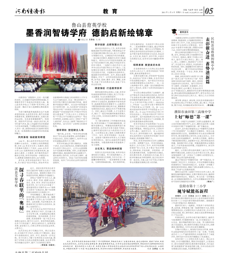 《河南经济报》于2025年3月8日在教育版头题位置,报道了鲁山县育英学校的办学事迹。